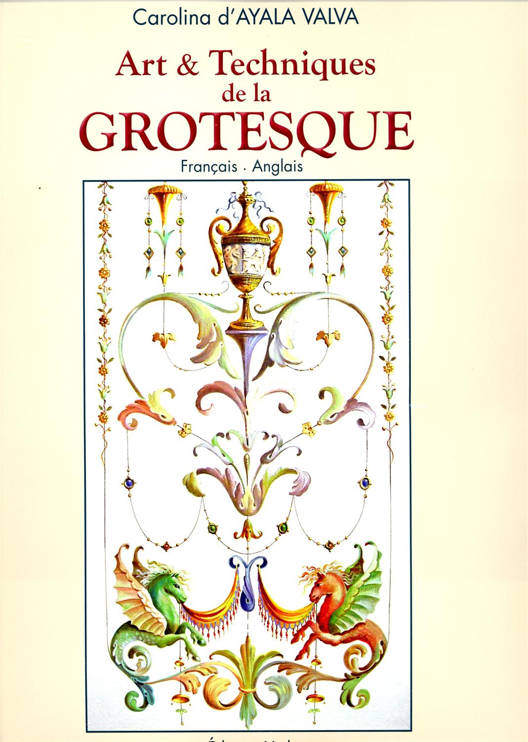 Livre neuf. Art et techniques de la grotesque. Les grotesques sont un genre de peinture ou de sculpture décorative, qui consiste en une combinaison étrange de feuillages, de fleurs, de fruits et d'autres éléments extraits du répertoire végétal, accompagnés d'animaux fantastiques ainsi que de figures humaines tressées ensemble de manière capricieuse qui n'a rien à voir avec la nature.