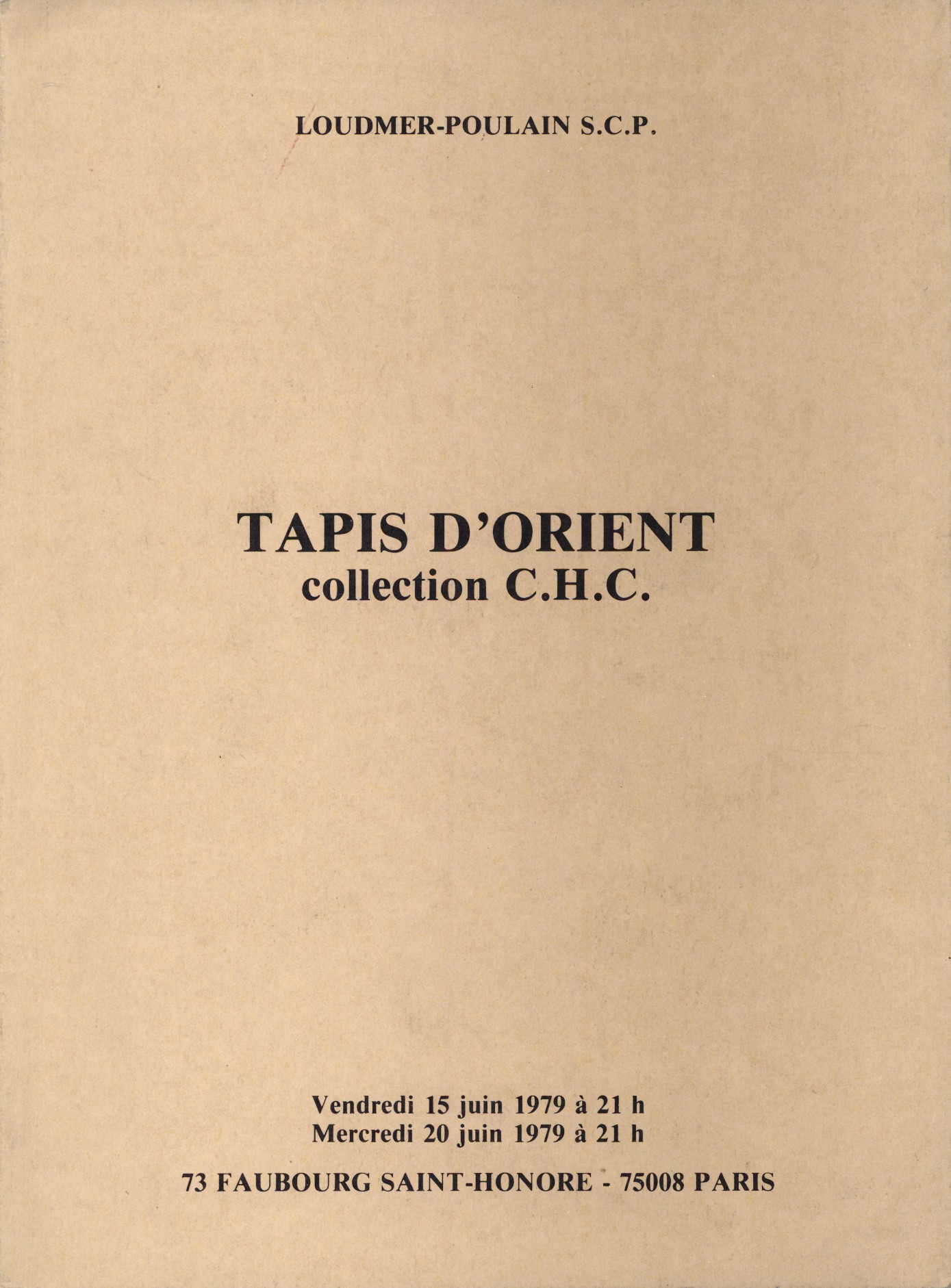 Tapis d'Orient Collection C.H.C.Catalogue de la vente aux enchères Tapis d'Orient collection C.H.C. (Important ensemble de tapis du Caucase...), qui s'est tenue les 15 et 20 juin 1979 à l'Hôtel des Ventes 73, Faubourg St Honoré. Cet ouvrage présente 136 numéros avec description et reproduction en noir et blanc ou en couleurs de chaque pièce.